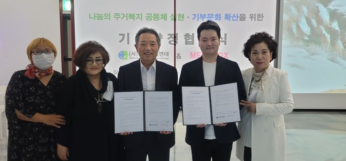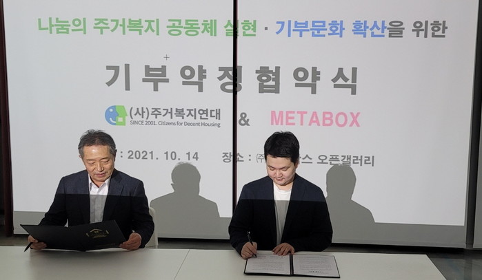 협약식에는 남상오 주복연 이사장, 김유정 주거안정팀장, 지병숙 회장(메타박스), 최영완 대표(메타박스), 메타박스 1호 작가 손서영 화백(한국문화예술인환경사랑연합회 회장)이 참석한 가운데 진행되었다.