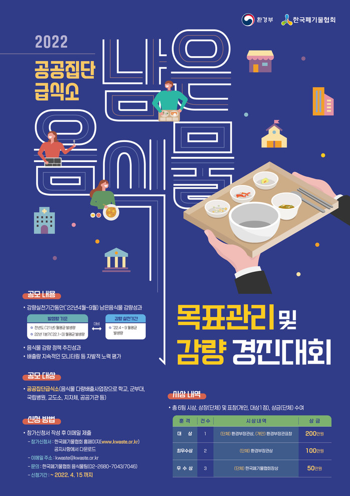 2022년 감량경진대회는 4월 15일까지 한국폐기물협회를 통해 신청서 접수를 받고 있으며, 공공기관, 학교, 군부대, 병원, 기업 등 공공집단급식소를 운영하는 기관이면 신청하여 남은음식물 발생량 저감에 동참할 수 있다.