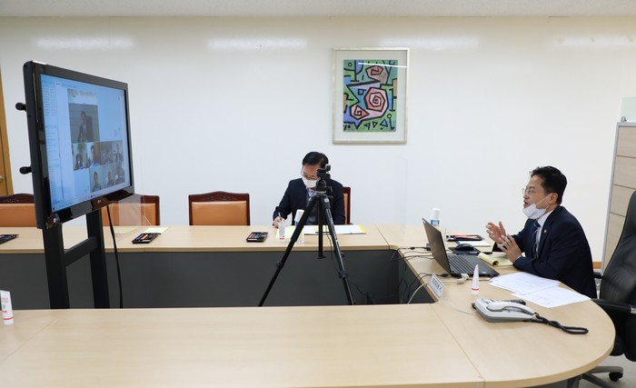 | ▲ 온라인 화상 토론회를 진행하고 있는 김정우 조달청장의 모습 (사진출처=조달청) |