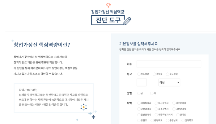 ‘핵심역량 진단’ 메뉴는 4차 산업 혁명 시대와 함께 격변하고 있는 산업구조에 대응할 수 있는 재능과 태도 및 의지를 함양하여, 창업 여부와 무관하게 능동적으로 시대 변화에 적용하고 ‘미래 사회의 건강한 사회 구성원이 되려면 어떻게 해야 하는지?’ 에 대해 진단한다. 창업가정신 핵심역량 진단 도구를 통해 청소년들이 자신의 창업가적 역량을 발견하여 그 키워드를 기반으로 효과적인 진로 설계를 할 수 있도록 개발하였다.