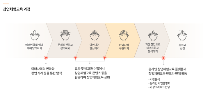 ‘가상 마켓’ 메뉴에서는 창업체험교육 홈페이지 내에서 가상 화폐 “잎”을 활용해서 직접 창업 동아리 아이디어 상품을 거래해서 상품 유통과 판매 과정을 체험할 수도 있는 프로그램이다. 또한, ‘창업체험교육백서’ 등의 발간자료와 교수 학습자료, 홍보영상 등의 콘텐츠 또한 제공하는데 각 부처에서 추진 중인 초·중동 창업체험교육 관련 사업을 인프라, 교육 프로그램, 콘텐츠 행사로 분류해서 종합적인 정보 제공하므로, 학교 현장에서도 찾아볼 수 있다.