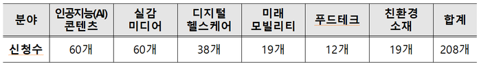 분야별 접수현황을 보면 ‘인공지능(AI) 콘텐츠’와 ‘실감미디어’ 분야에 가장 많은 스타트업이 참여했고 ‘디지털 헬스케어’, ‘미래 모빌리티’, ‘친환경 소재’, ‘푸드테크’ 분야 순서대로 많았다.