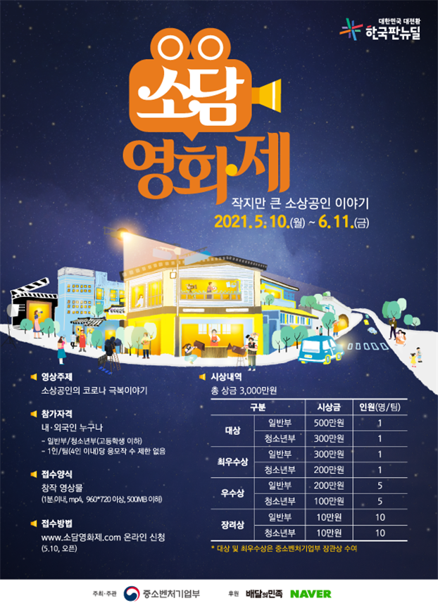 김중현 중기부 홍보담당관은 “소담 영화제는 소상공인의 코로나 극복 우수 사례 발굴 및 확산을 통해 위기 극복의 긍정적 메시지를 전파하고자 기획된 것”이라며 “작지만 강한 소상공인들의 다양한 이야기로 소담 영화제에 많은 참여를 부탁드린다”고 전했다.