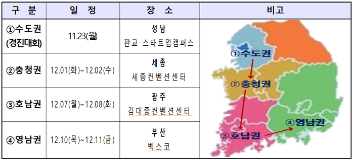 ‘제 1회 혁신조달 경진대회’의 본선진출 우수사례 전파와 혁신기업의 공공조달시장 진입을 지원하기 위한 두 번째 행사로, 충청권은 ▲12월 1일부터 2일까지 세종특별시 ‘세종 컨벤션 센터’에서, 호남권은 ▲12월 7일부터 8일까지 광주광역시 ‘김대중 컨벤션 센터’에서, 영남권은 ▲12월 10일부터 11일까지 개최하여 혁신제품의 우수성을 적극 홍보할 예정이다.