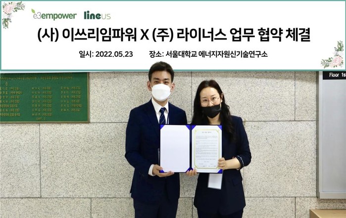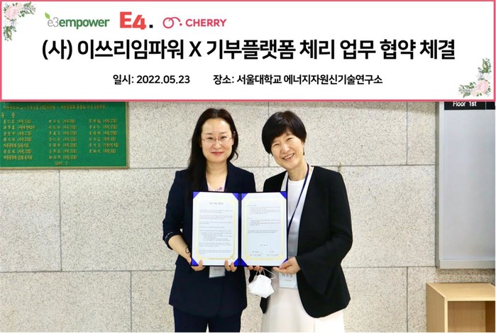 사단법인 이쓰리임파워(대표 문지현, E3Empower)는 IT 전문기업 이포넷(대표 이수정)과 ‘블록체인 기반 기부플랫폼 체리(이하 체리)’ 사용 및 NFT 발행을 위한 업무 협약을 서울대학교 에너지자원신기술연구소에서 체결했다고 지난 5월 23일 밝혔다.