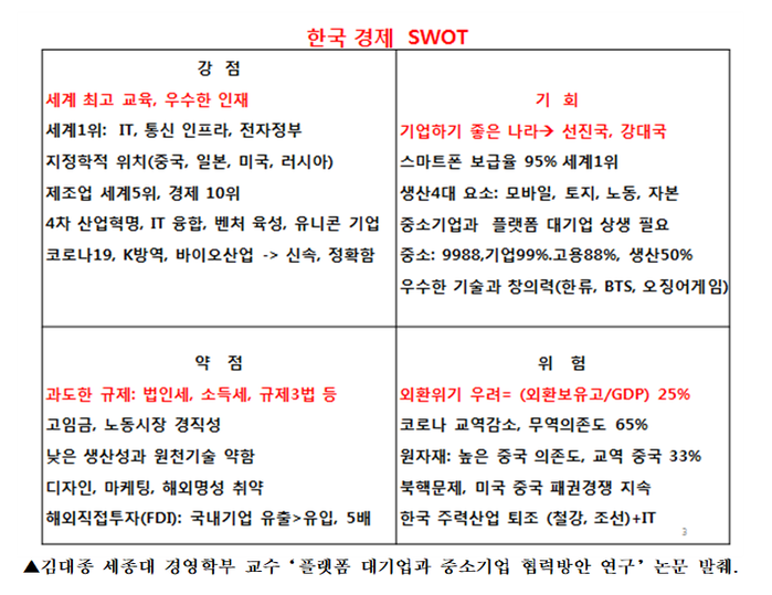 김 교수는 “한국은 AI, 사물인터넷, 전기차 그리고 BBIG(바이오, 밧데리, 인터넷, 게임) 등 4차 산업혁명을 주도하자. 개방과 혁신이라는 세계적인 큰 흐름에 순응하자. 주 52시간 등 규제는 줄이고, 기업하기 좋은 나라를 만들어야 한다”고 강조하여 말했다.
