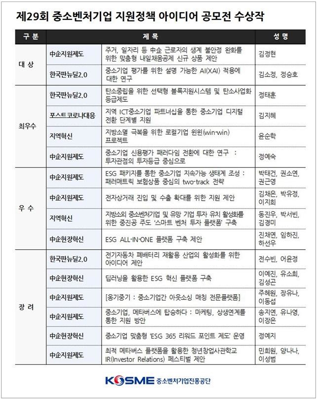 우수상에는 ▲ESG 패키지를 통한 중소기업 지속가능 생태계 조성: 패러매트릭 보험상품 중심의 two-track 전략(박태건‧권소연‧권근영) ▲전자상거래 진입 및 수출 확대를 위한 지원 제안(김채은‧박유정‧이지희) ▲지방소외 중소벤처기업 및 유망기업 투자유치 활성화를 위한 중진공 주도 ‘스마트 벤처 투자 플랫폼 구축’(동진우‧박서빈‧김경미) ▲ESG ALL-IN-ONE 플랫폼 구축 제안(진채연‧임하진‧하선우)이 선정됐다.
