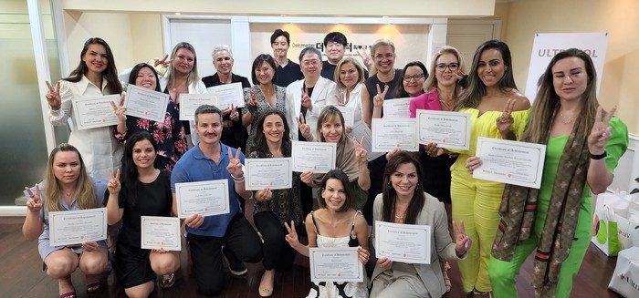 | ▲ 브라질 의사들이 최신 미용의료 시술 교육을 마친 후 권한진 대표와 기념사진을 촬영하고 있다<사진제공=울트라브이> |