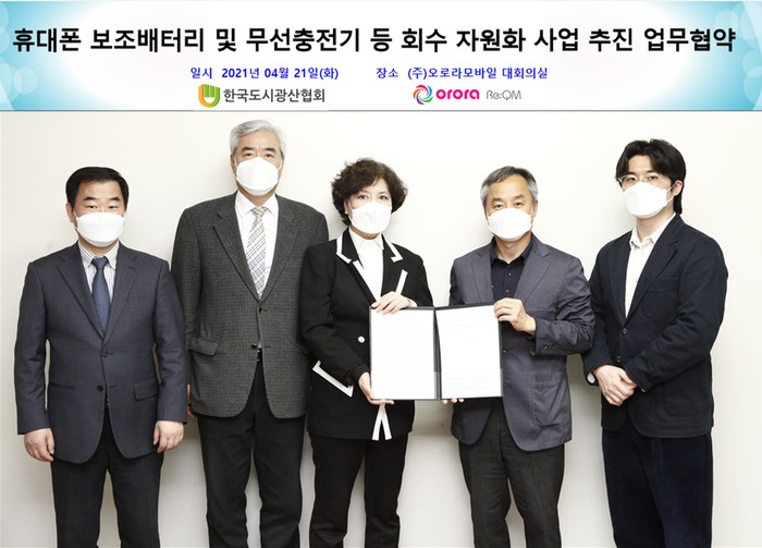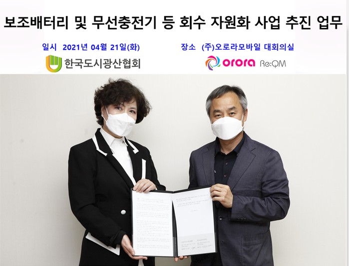 (사)한국도시광산협회(회장 염운주, 이하 협회)와 ㈜오로라모바일(대표이사 박범천)는 지난 21일, 서울 영등포구 ㈜오로라모바일 대회의실에서 ‘휴대폰 보조배터리 및 무선충전기 등 회수 자원화 사업 추진 계획’ 협력을 위한 전략적 업무제휴 협약(MOU)을 체결했다고 22일 밝혔다.