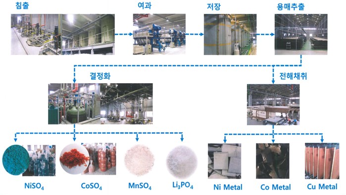 | ▲ 입고된 사용 후 배터리는 물리적 전처리 공정을 거쳐 습식공정을 통한 분리정제, 소재화 공정까지 모두 포함하여 처리하고 있다. 사용 후 배터리의 재활용 공정(습식 분리 정제 및 소재화 공정)<사진제공=성일하이텍> |
