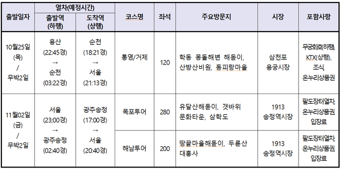 ‘16년부터 봄, 가을 여행 주간에 특별 운영하고 있으며, 실제 여행에 필요한 금액은 약 4만~12만원이지만 이용객은 단돈 1만원만 내고 나머지 비용은 중소벤처기업부와 문화체육부가 지원하기 때문에 자유로운 기차여행과 함께 대한민국 숨은 명소와 전통시장까지 체험할 수 있다.