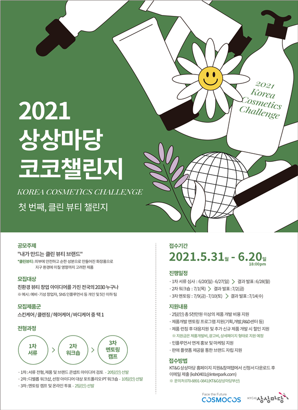 KT&G 상상마당 부산은 ‘꽃을든남자’, ‘다나한’, ‘비프루브’ 등 브랜드로 알려진 화장품 전문기업 ㈜코스모코스와 협업해 최종 선정 2팀의 제품 제작과정 전반을 지원할 예정이다.