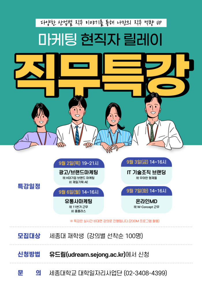 특강은 모두 2시간동안 진행되며 실시간 비대면 프로그램(ZOOM)을 통해 진행되며, 모집 인원은 강의별 선착순 100명이다. 신청은 학생경력개발시스템(유드림)으로 개별 접수할 수 있다. 자세한 내용은 대학일자리사업단으로 문의하면 된다.