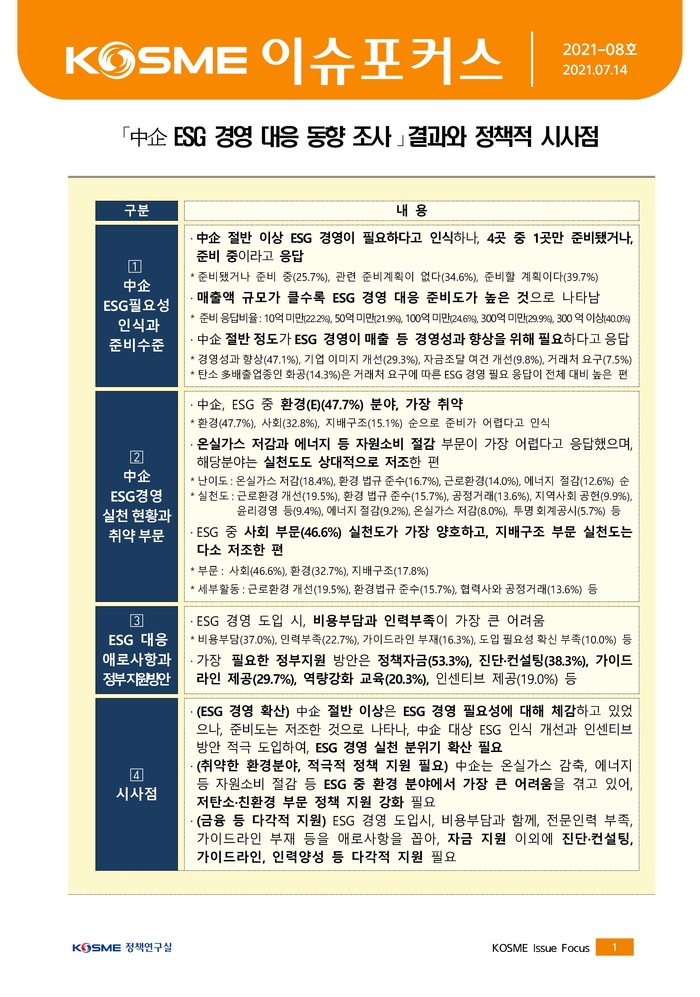 | ▲ KOSME 이슈포커스(「中企 ESG 경영 대응 동향조사」 결과와 정책적 시사점) (21년 8호) |