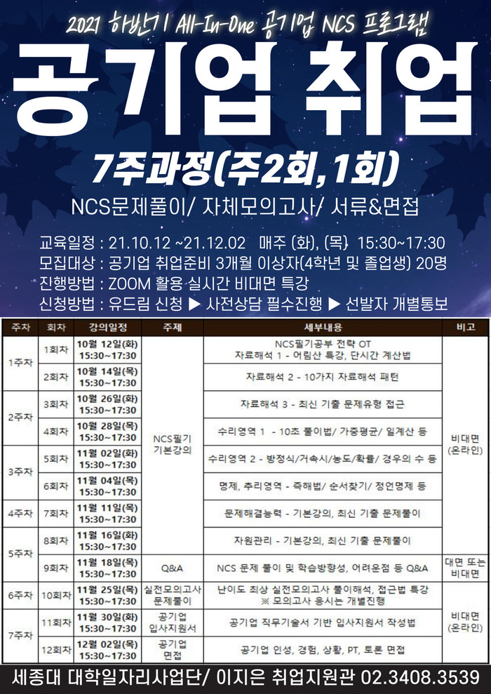 프로그램에서는 △공기업 채용 트렌드와 NCS채용 대비 전략 △NCS 직업기초능력 필기대비 문제풀이 및 모의고사 △NCS 서류 및 면접특강 등을 진행하여 학생들이 서류부터 면접까지의 전체적인 이해와 실전에 대비할 수 있도록 한다.
