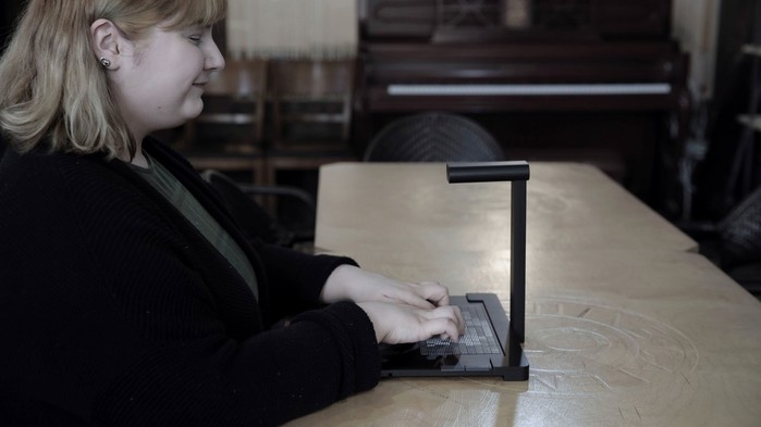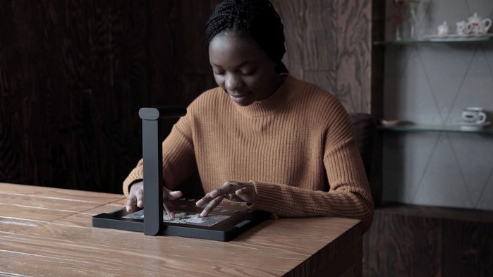 | ▲시각장애인 학생이 촉각 디스플레이(닷 패드)에 출력된 이미지를 읽고 있는 모습 (사진제공=닷) |