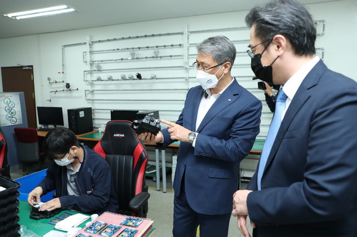 | ▲ 박재현 한국수자원공사 사장(사진 가운데)이 대전소재 물산업 중소기업을 방문해 개발 중인 신제품 관련 설명을 듣고 있다<사진제공=K-water> |