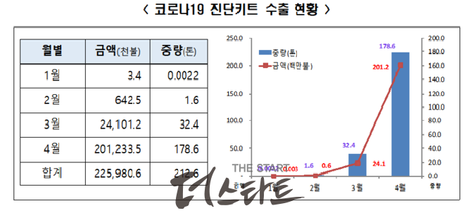 | ▲한국의 진단키트 수출액은 4월 기준 2억 달러를 넘어섰다. [출처=관세청] |