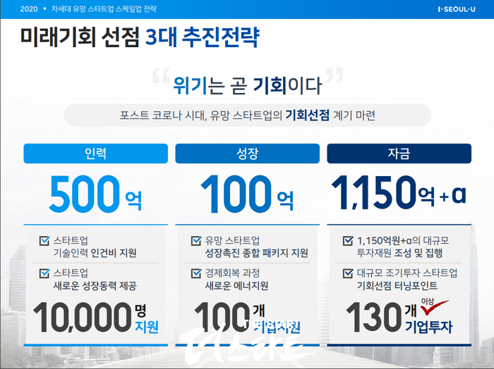 서울시가 경정한 ‘3대 육성전략’이란 ①스타트업 기술인력 1만 명 인건비 지원(500억 원), ②유망 스타트업 100개사에 1억 원의 성장촉진 종합 패키지 지원(100억 원), ③새로운 펀드 조성으로 기회선점에 투자(1,150억+α)다. 위 3가지는 서울시가 4차례에 걸친 국내‧외 스타트업과의 회의를 통해 결정한 것이다.