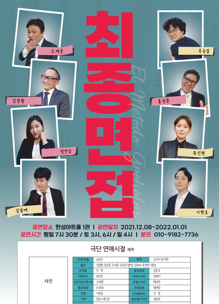 연극 '최종면접'은 스페인 작가인 조르디 갈세란의 ‘그뢴홀름 방법론’을 원작으로 한 블랙코미디이다. 이 작품은 스페인을 비롯해 중남미 각국에서 공연되고 있으며 상업 연극보다 더 상업적인 연극이 가진 재미와 전통 연극의 작품성을 간직한 작품이다.