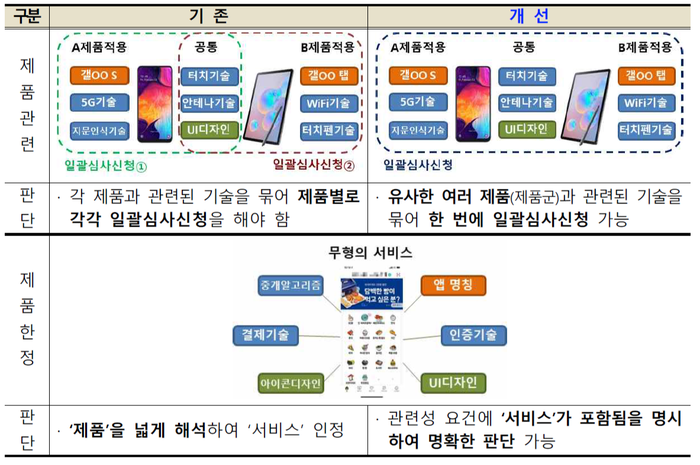 위와 같은 애로사항을 해결하기 위해, 특허청은 ‘하나의 제품’과 관련된 일괄심사 신청요건을 ‘서비스’를 포함하는 ‘하나의 제품군’ 등으로 확대했으며 디지털 융·복합기술(인공지능, 사물인터넷 등)을 바탕으로 ▲비대면화, ▲온라인화 플랫폼 서비스 등을 준비하는 기업들이 손쉽고 자유롭게 다양한 지식재산권을 확보할 수 있게 됐다.