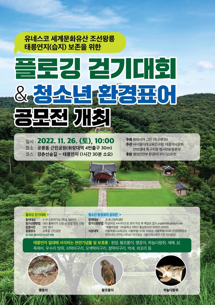 ‘유네스코 세계문화유산 조선왕릉 태릉연지(습지)보존 위한 플로깅 걷기 대회’와 함께 진행되는 ‘청소년 환경표어경연·걷기대회’는 청소년(초·중·고등학생)을 대상으로 환경보전에 대한 인식 강화와 함께 건강한 체력과 올바른 체육교육을 통한 인성교육 실천을 위해 마련됐다.