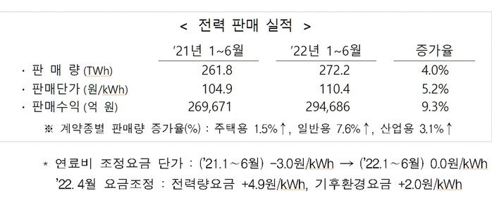 전년 동기 대비 주요 증감요인을 세부적으로 살펴보면, 전기판매수익은 제조업 평균가동률 증가(73.9→77.1%) 등으로 판매량이 4.0% 증가했고, 요금조정으로 판매단가가 상승해 2조 5,015억 원 증가했다.