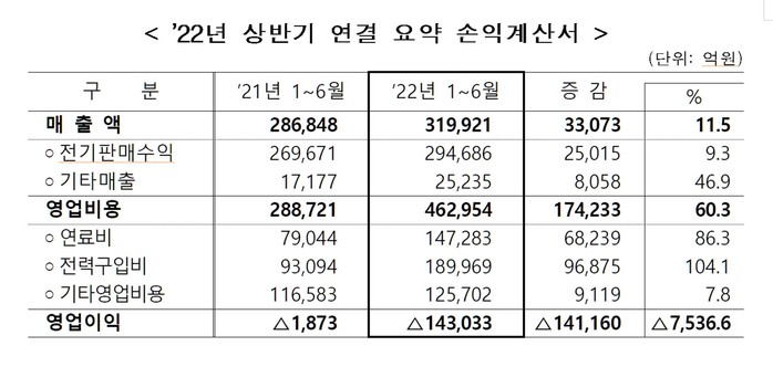 이는 전년 동기 대비 손실금액이 14조 1,160억 원 증가한 것으로, 매출액은 전력판매량 증가와 요금조정에도 불구하고 3조 3,073억 원 증가에 그친 반면, 영업비용은 연료가격 급등 등으로 17조 4,233억 원 증가한 데 기인했다.