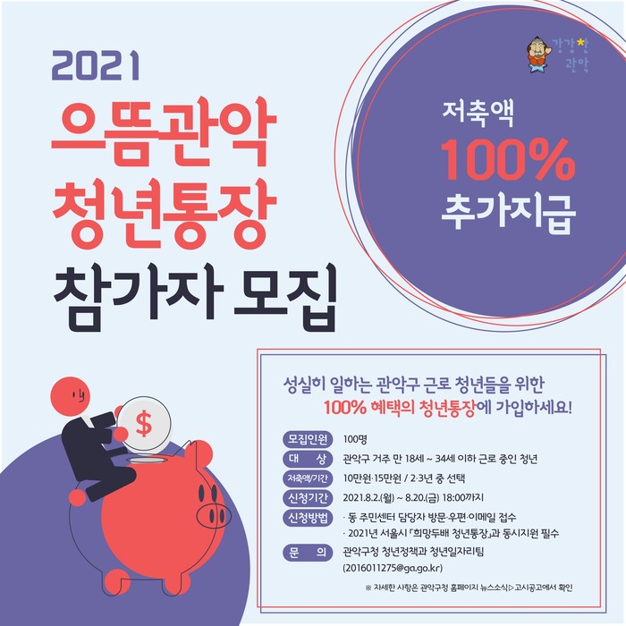 가입 대상은 관악구에 거주하는 만18세~34세 이하의 근로 중인 청년으로, 소득기준은 본인 근로소득 세전 월 255만 원 이하, 부양의무자(부모 또는 배우자) 소득인정액 기준중위소득 80% 이하를 충족해야 한다.