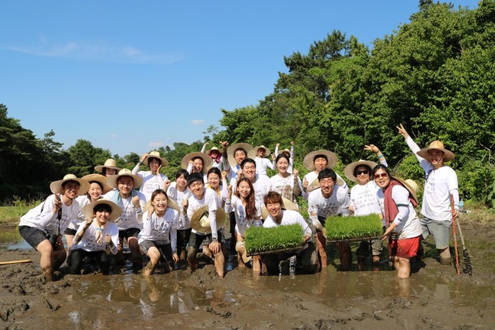 | ▲ 손 모내기 체험행사, 약 30명이 모여 농부의 모내기를 돕고 있다 (사진출처=농사펀드, 이로운넷) |