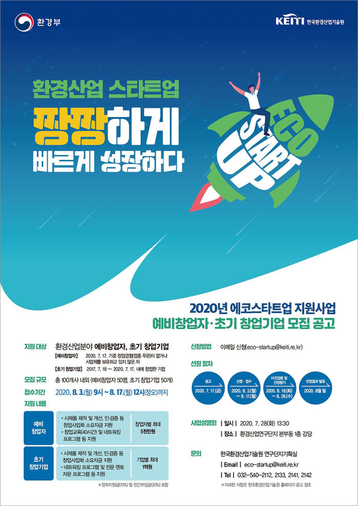 녹색산업 육성을 위한 환경분야 우수 아이디어와 기술을 보유한 예비 창업자 발굴·육성 및 초기창업기업(창업 3년이내)의 안정적 성장을 지원하는 「2020년 에코스타트업 지원사업」에 참여할 예비창업자 및 초기창업기업 모집