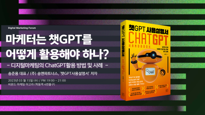 디지털마케팅연구회는 오는 3월15일 서울 강남구 소재 비욘드마케팅 아고라에서 '마케터는 챗GPT를 어떻게 활용해야 하나'를 주제로 오프라인 세미나 개최한다고 -일 밝혔다.