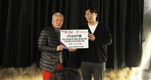 | ▲ 상상이룸 김주석 대표(오를쪽)가 성남시장애인탁구협회 김성태 회장(왼쪽)에게 후원금을 전달하고 있다<사진제공=상상이룸> |