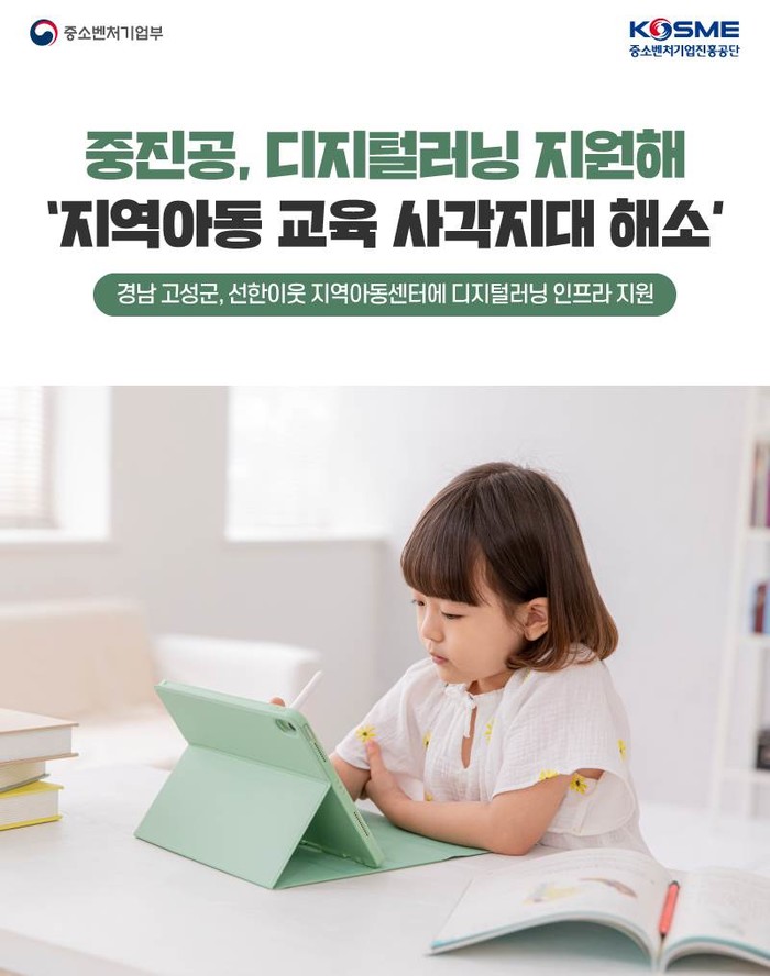 김병수 중진공 경영관리본부장은 “지역에 소재한 유망기업과 함께 손잡고 아동들을 위한 디지털 러닝 인프라를 지원할 수 있어 뜻깊게 생각한다”면서, “중진공은 교육 안전망을 구축해 사각지대를 해소하고, 미래인재 육성과 사회적가치 실현에도 앞장서겠다.”고 말했다.