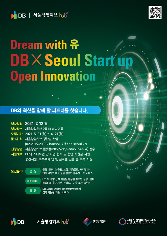 ‘Dream with 유 DB x Seoul Startup Open Innovation’은 금융 산업과 제조·서비스 산업에 혁신적인 기술을 가진 스타트업을 발굴하는 프로그램으로 약 3개월간의 협력 프로그램을 통해 투자유치 및 기술협력을 브랜딩 할 예정이다.