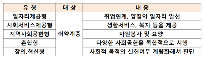 | ▲ '소셜 벤처' 의 유형을 내용별로 구분하였다. 대상이 모두 동일하다는 점에서 사회적 기업이라고 할 수 있다. |