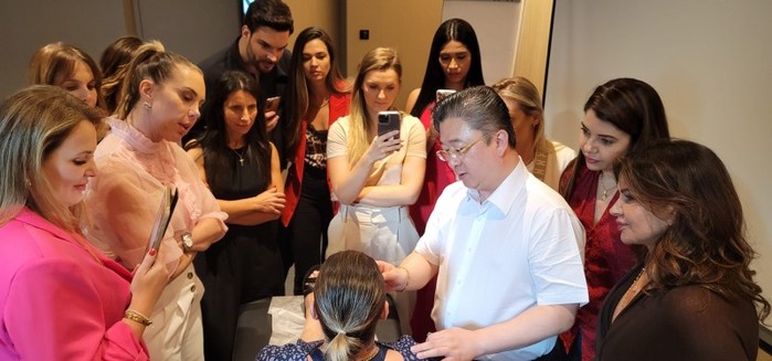 이날 세계적인 안티에이징 성형 트렌드로 떠오르는 미용성형 의료기기 및 리프팅실, 콜라겐부스터의 강점에 대해 강연하고 라이브 시연했다.