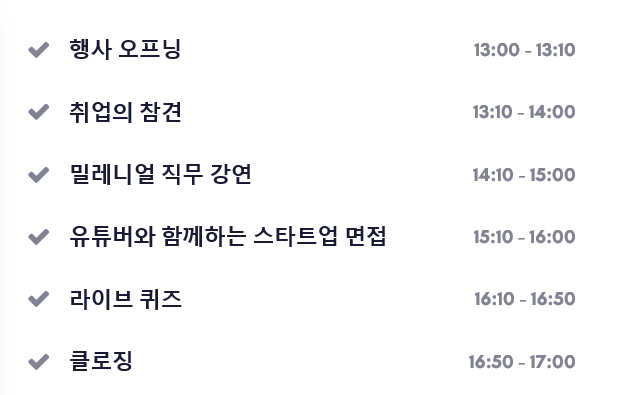 또한, 11월 11일(수)부터 전문 사회자가 진행하는 ‘취업의 참견’, ‘밀레니엄 직무 강연’, ‘라이브 퀴즈’와 인기 유튜버가 함께 참여하는 ‘스타트업 모의면접’ 등의 행사를 진행할 계획이다.