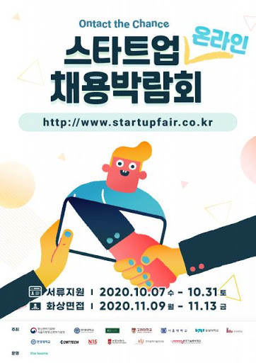 [더스타트 = 윤상학 기자] 중소벤처기업부는 연세대학교를 포함한 수도권 8개 대학교와 한국기술벤처재단, 한국과학기술연구원 등의 총 13개 기관이 공동으로, ‘Ontact The Chance 스타트업 온라인 채용 박람회’가 지난 10월 7일부터 11월 13일까지 열린다고 밝혔다.