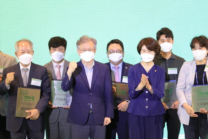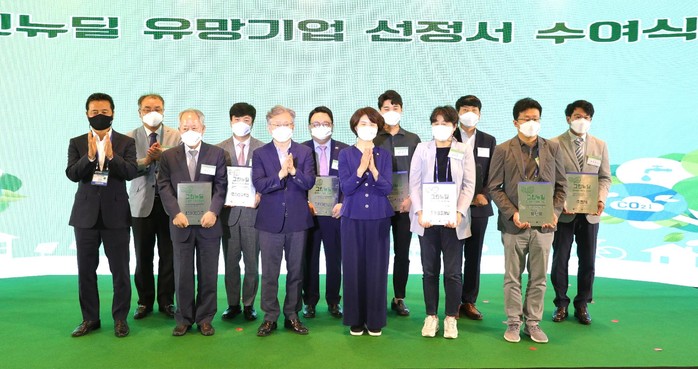 이날 행사는 두 부처 장관이 유망기업 대표에게 ‘그린뉴딜 유망기업 선정서와 동판’을 수여한 후, 대표기업 2개사의 우수사례 발표에 이어 대면-비대면으로 참여한 기업들과 간담회를 갖는 순으로 진행됐다.