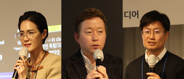 | ▲ (왼쪽부터)사례 발표를 한 김민선 kT cloud 팀장과 이호용 롯데면세점 팀장, 구글 김경태 상무<사진제공=한국지식서비스산업협의회>. |