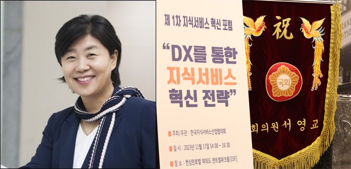 | ▲ 서영교 의원(더불어민주당 최고위원, 기획재정위원회)이 ‘DX를 통한 지식서비스 혁신 전략’이란 주제로 진행된 제 1차 지식서비스 혁신 포럼에서 한국지식서비스산업협의회 창립과 포럼에 응원의 축전과 함께 축기를 보내왔다<사진제공=한국지식서비스산업협의회>. |