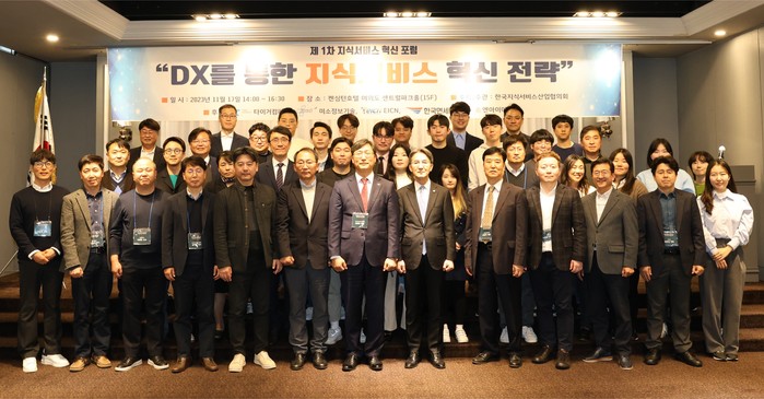 | ▲ 11월 17일(금), 서울 켄싱턴호텔 여의도 센트럴파크홀에서 ‘DX를 통한 지식서비스 혁신 전략’이란 주제로 진행된 제 1차 지식서비스 혁신 포럼에서 참석자들과 함께 기념사진을 촬영하고 있다<사진제공=한국지식서비스산업협의회> |