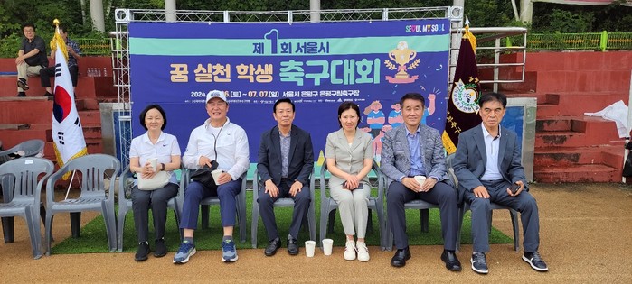 | ▲ (왼쪽부터)박용희(여) 연맹 행정부회장, 박주한 서울시 체육회 수석 부회장, 김경수 연맹회장, 이승미(여) 서울시 의회 의원 교육위원장, 조병득 전)대한축구협회 부회장, 이승수 연맹 수석부회장/사진제공=국제다문화축구연맹 |