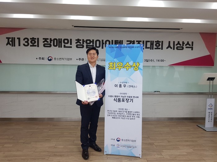 | ▲ '캔웍스'의 이종우 대표가 장애인 창업 대회에서 최우수상을 수상했다. (사진출처=AI타임즈) |