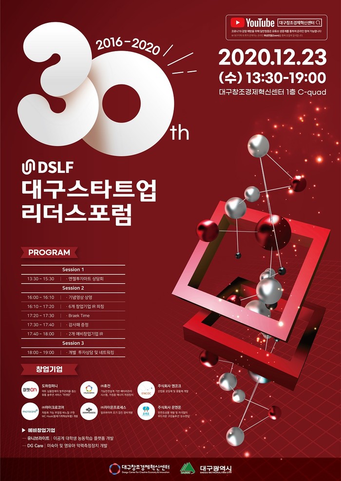 [더스타트 = 정아라 기자] 대구창조경제혁신센터는 지난 18일, 8개 기업의 투자 유치를 위한 설명회를 온라인으로 추진하는 「대구 스타트업 리더스 포럼」 을 오는 23일 16시부터 18시까지 개최한다고 밝혔다.