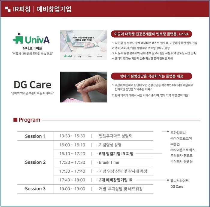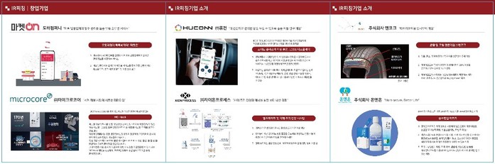 참여기업으로는 유통 서비스 ‘마켓온’으로 유명한 ▲㈜도하컴퍼니, 기능안정설계 기반 배터리 관리 시스템을 개발한 ▲㈜휴컨, 산업용 코팅제 및 윤활제를 생산하는 ▲㈜엔코크와 봉제 기계 혁신 부품을 제안하는 ▲㈜마이크로코어, 알츠하이머 조기 검진 장비를 개발하는 ▲㈜자이온프로세스, 천연조성물을 사용한 자극 없는 구강 솔루션 ‘순수한입’을 서비스하는 ▲㈜온앤온이 있다.