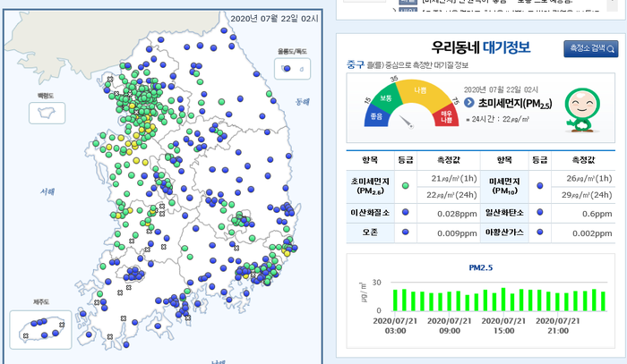 | ▲ 한국환경공단 'Air-Korea' 사이트에서 제공하는 실시간 대기오염정보 시스템이다. (사진출처=에어코리아) |