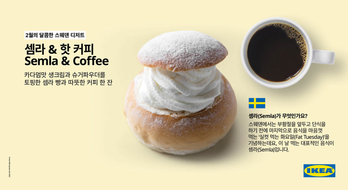 이케아 코리아는 셈라 출시와 함께 2월 1일부터 28일까지 세트 메뉴 할인 행사를 진행한다. 이케아 패밀리 회원을 대상으로 평일 오후 2시부터 5시까지 셈라와 따뜻한 커피 세트를 특별가로 제공한다.