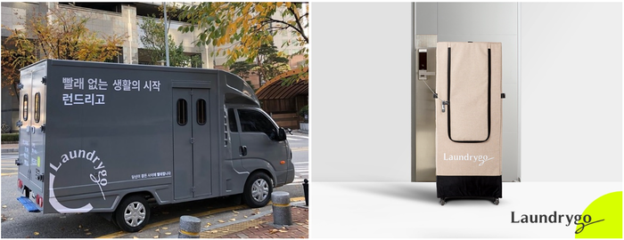 | ▲ 런드리고에서 서비스하는 세탁물 회수 차량과 세탁물 통 "런드렛 (사진출처 = 플래텀) |